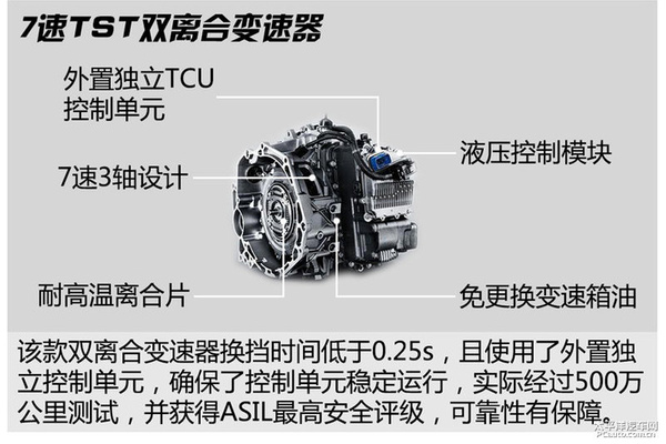 搭配在1.4T發(fā)動機上的是7速雙離合變速器,該變速器使用了外置獨立的TCU控制單元,能確?刂茊卧(wěn)定運行,此外離合片采用特殊材料設計,耐熱溫度高達500°c,能更好地應對中國城市頻繁起步的擁堵路況。上汽方面已經(jīng)對該變速器進行了500萬公里的全國道路測試,在可靠性方面更有保證。