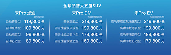 央廣網(wǎng)北京7月12日消息(記者李尚)11日,比亞迪宋Pro在國家游泳中心(水立方)正式上市。新車共有燃油、插電式混動、純電三大動力,共計12款車型重磅登場,其中,宋Pro燃油官方指導價8.98萬-11.98萬元;宋Pro DM綜合補貼后價格16.98萬-21.98萬元;宋Pro EV綜合補貼后價格17.98萬-21.98萬元。官方售價明細如下: