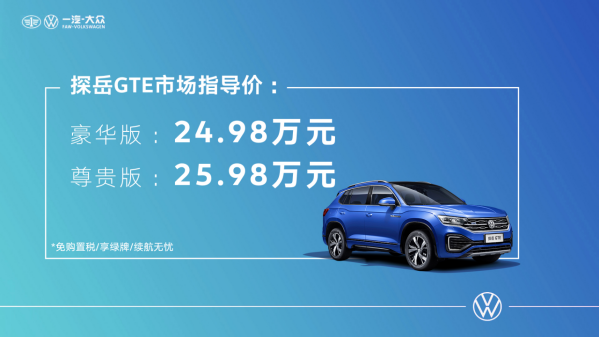 日前,一汽-大眾大眾品牌首款SUV新能源車型——探岳GTE澎湃上市,提供豪華版和尊貴版兩款車型,售價分別為24.98萬元、25.98萬元。