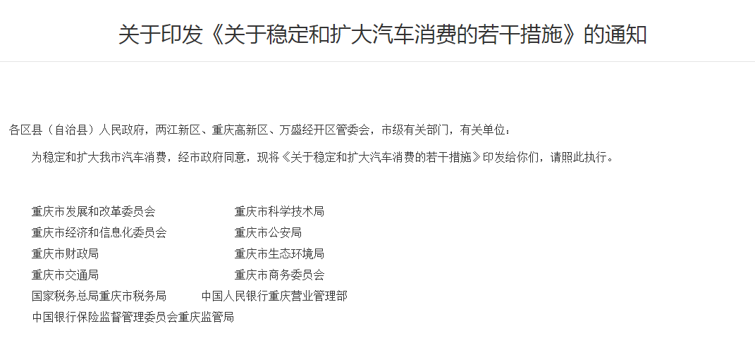 記者日前從重慶市發(fā)改委獲悉,重慶市發(fā)改委等11部門聯(lián)合發(fā)布了關(guān)于印發(fā)《關(guān)于穩(wěn)定和擴(kuò)大汽車消費(fèi)的若干措施》的通知。