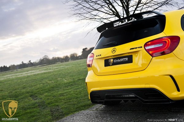 由于RevoZport和Mulgari所帶來的外觀升級,這款兩廂車變得更加動感時尚。改裝套件包括碳纖維前分離器、雙碳纖維鴨翼以及熏黑的進(jìn)氣格柵,發(fā)動機(jī)罩也涂成了黑色,并且添加了雙凸起的設(shè)計(jì)。而在車身尾部,改裝廠還為其安裝了新的擴(kuò)散器以及靈感來自一款限量版A45 AMG的尾翼。