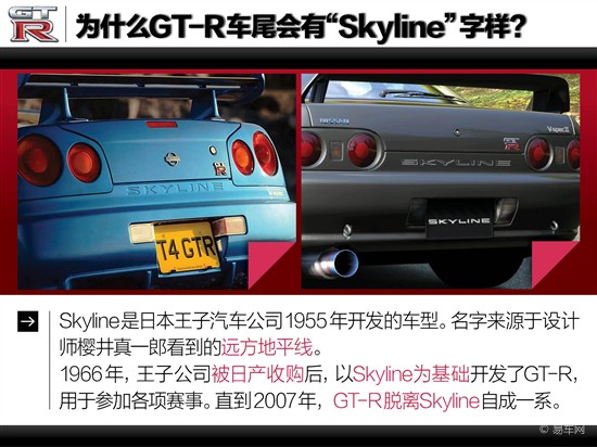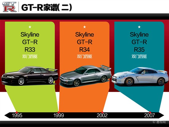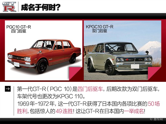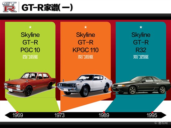 ps:第一代GT-R后期改款為KPGC 10,從四門變?yōu)殡p門。而且R33期間,為紀念Skyline40周年還推出過四門特別版。