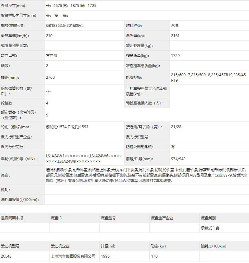 在車身尺寸方面,新車的長寬高分別為4676/1875/1725mm,軸距為2760mm,整備質量為1729kg,輪胎擁有215/60R17、235/50R18、235/45ZR19、235/45R19四種規(guī)格可供選擇。配置方面,新車將提供天線、卡鉗、輪輞、行李架、側前雷達、側后雷達等多種配置選擇。在動力方面,新車將搭載1.5T和2.0T渦輪增加發(fā)動機,最大輸出功率為133kW和170kW。