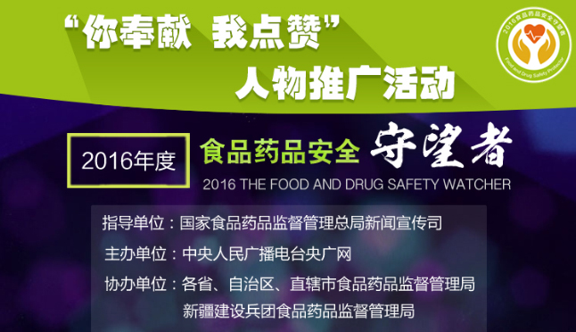 2016“食品藥品安全守望者”宣傳活動,由國家食品藥品監(jiān)督管理總局新聞宣傳司指導(dǎo),中央人民廣播電臺央廣網(wǎng)主辦并在全國范圍內(nèi)開展,包括“人物事跡挖掘”、“人物事跡推廣”、“現(xiàn)場評選揭曉及風(fēng)采展示”三大主體內(nèi)容,旨在全面展示我國食品藥品監(jiān)督管理高要求與行業(yè)發(fā)展新氛圍,傳遞以人為本、共治共享的食品藥品安全理念。