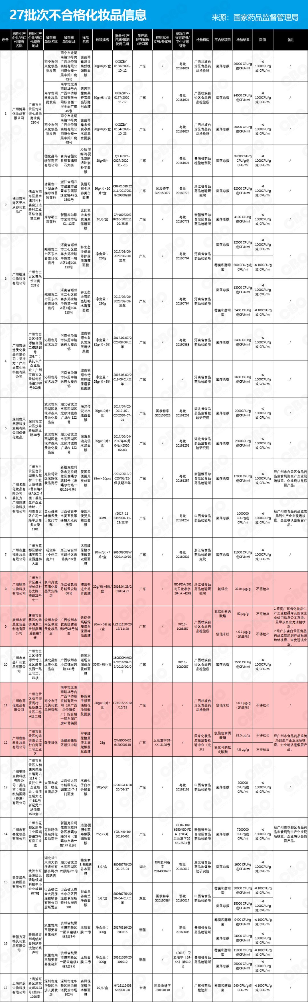 央廣網(wǎng)北京9月25日消息 國(guó)家藥品監(jiān)督管理局發(fā)布了《關(guān)于27批次化妝品不合格的通告(2018年第45號(hào))》,經(jīng)廣西壯族自治區(qū)食品藥品檢驗(yàn)所等檢驗(yàn),標(biāo)示為廣州博羿化妝品有限公司等17家企業(yè)生產(chǎn)(代理)的27批次化妝品不合格。