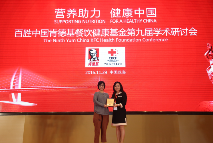 百勝中國公共事務(wù)副總裁王立志女士為百勝中國肯德基餐飲健康基金2016年度資助項目授牌
