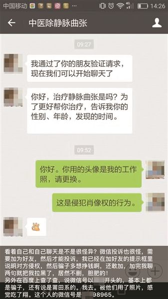 袁醫(yī)生介紹說,不久前有患者向自己反映稱,一個(gè)名為“中醫(yī)除靜脈曲張”的微信賬號疑似打著袁醫(yī)生的名號為大家看病診治。袁醫(yī)生添加該微信號后發(fā)現(xiàn),對方所使用的頭像恰好是自己在醫(yī)院拍攝的身穿白大褂的工作照,此前曾被自己用作微博頭像。一番交涉后,對方答應(yīng)撤掉袁醫(yī)生的照片,但卻遲遲沒有行動,后來還索性將袁醫(yī)生拉入黑名單中。