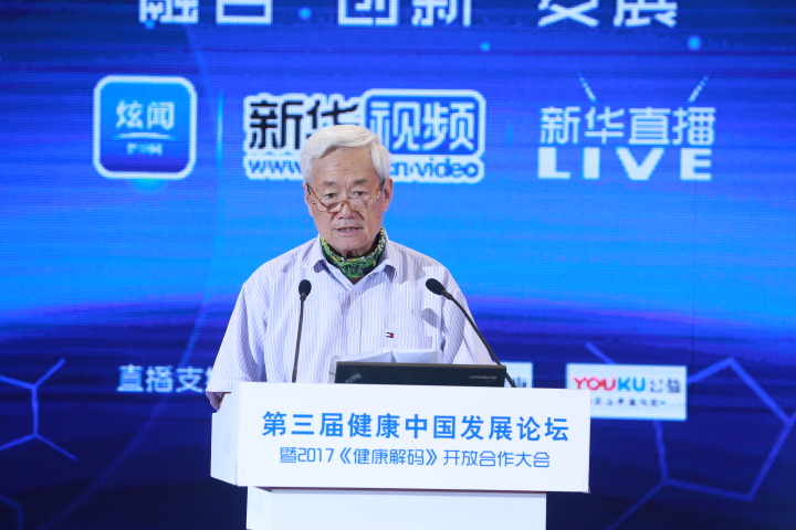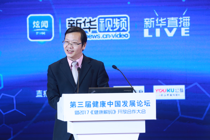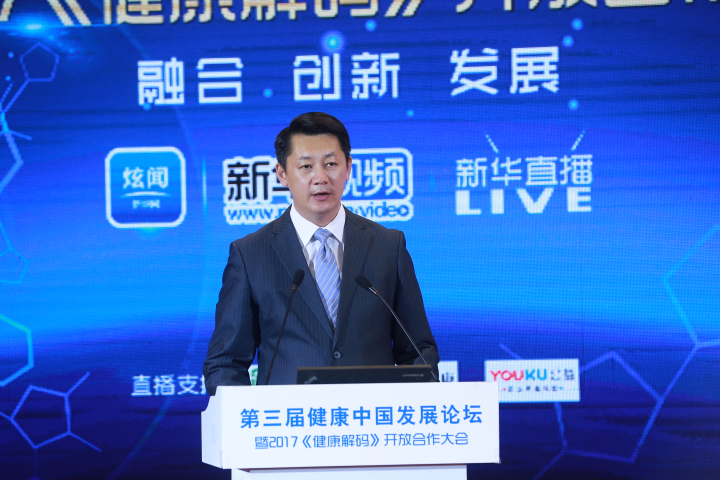 圖為新華網(wǎng)總裁助理劉宏偉為第三屆健康中國(guó)發(fā)展論壇暨2017《健康解碼》開放合作大會(huì)致辭