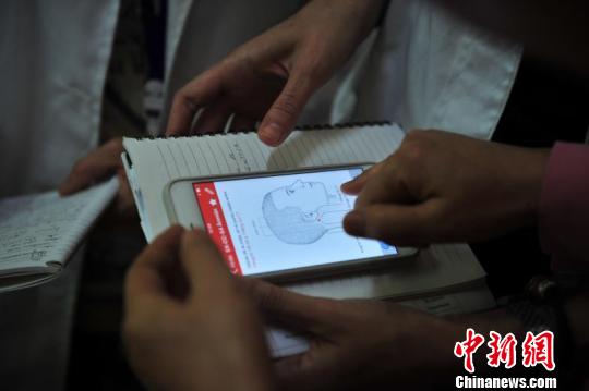 圖為在云南省中醫(yī)醫(yī)院見習(xí)的外國(guó)中醫(yī)師結(jié)合app學(xué)習(xí)針灸。 劉冉陽(yáng) 攝