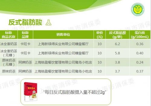 眾所周知,攝入過量反式脂肪酸,會(huì)影響健康,《中國居民膳食指南》建議每日攝入量不超過2克。但檢測發(fā)現(xiàn),卡旺卡、阿姨奶茶的4款樣品,反式脂肪酸均超過了這個(gè)標(biāo)準(zhǔn),最高的卡旺卡冰全套奶茶反式脂肪酸為6.2克/杯。值得注意的是,這4款奶茶的蛋白質(zhì)含量均不高,一定程度上說明原料可能并不健康。