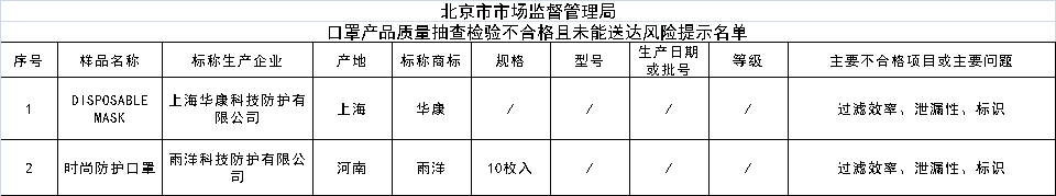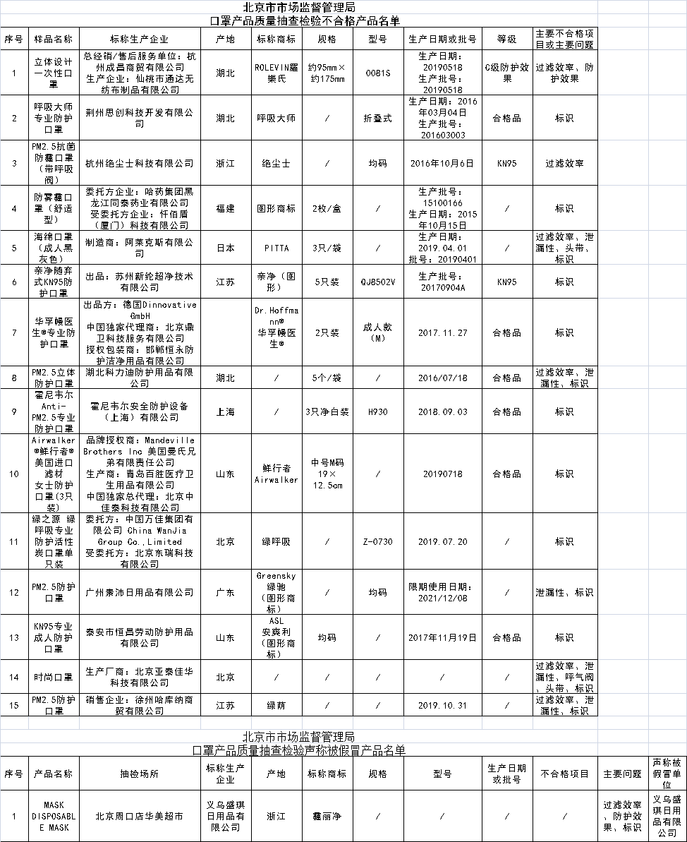 此外,在本次口罩產(chǎn)品質(zhì)量抽查檢驗(yàn)中,北京市市場(chǎng)監(jiān)管局發(fā)現(xiàn)部分產(chǎn)品存在質(zhì)量問(wèn)題且通過(guò)產(chǎn)品標(biāo)稱的企業(yè)地址及聯(lián)系方式無(wú)法與標(biāo)稱生產(chǎn)企業(yè)取得聯(lián)系,建議消費(fèi)者謹(jǐn)慎購(gòu)買(mǎi)下列標(biāo)稱企業(yè)的產(chǎn)品。