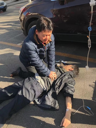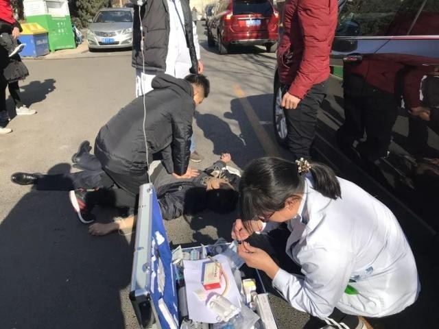 1月25日上午11時(shí)許,在海淀區(qū)學(xué)院路街道志新小區(qū)6號(hào)樓前,一名40多歲的藍(lán)衣男子突發(fā)疾病,昏倒在路邊,臉色發(fā)青,脈搏微弱,并伴有抽搐癥狀,與其同行的紅衣男子在寒風(fēng)中不斷呼救,神情焦急。