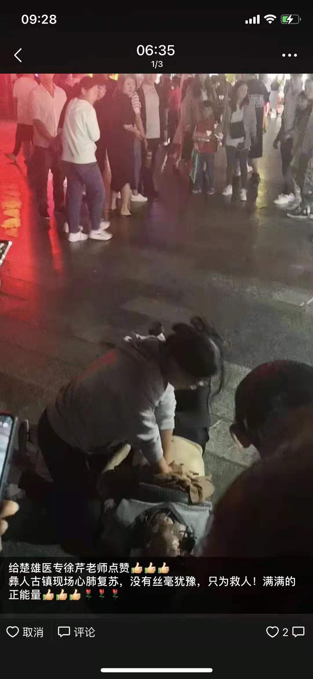 2020年10月2日晚,正值國慶黃金周的彝人古鎮(zhèn)街頭,游人涌動,車水馬龍。云南楚雄醫(yī)藥高等?茖W校教師徐芹與家人如往常一樣在街頭散步,愜意地感受著節(jié)日氛圍。突然,人群中一位男性老人摔倒在地,不省人事。剛好在附近的徐芹聞訊趕來,學醫(yī)的她敏銳地察覺到這不是一般的失足摔倒,于是立即檢查判斷老人的意識、脈搏和呼吸,并立刻采取了急救措施,緊急對老人進行心肺復蘇。在醫(yī)學急救中,對心臟驟停的患者有效實施心肺復蘇,尤其在被稱為“黃金時間”的最初4至6分鐘,是極其重要的急救操作。危機時刻,徐芹為老人實施心肺復蘇二十多分鐘,為老人贏得寶貴的搶救機會。