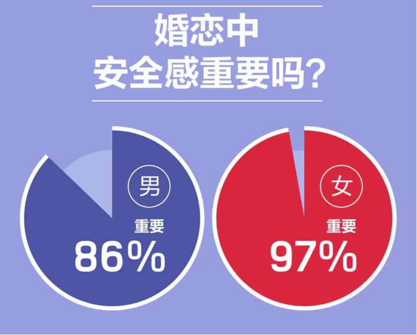 一直以來,安全感是親密關(guān)系中不變的話題,且存在性別差異。《報告》統(tǒng)計:86%的男性和97%的女性都認(rèn)為婚戀中安全感重要,其中近八成女性認(rèn)為安全感非常重要。