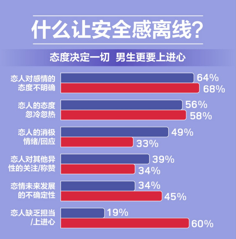 安全感在親密關(guān)系中的重要性不可言說,別讓安全感離線是男女必須學(xué)會的能力,態(tài)度決定一切。《報告》表明:64%的男性和68%的女性認(rèn)為“戀人對感情的態(tài)度不明確”,以及56%的男性和58%的女性認(rèn)為“戀人的態(tài)度忽冷忽熱”這兩項占比最高。