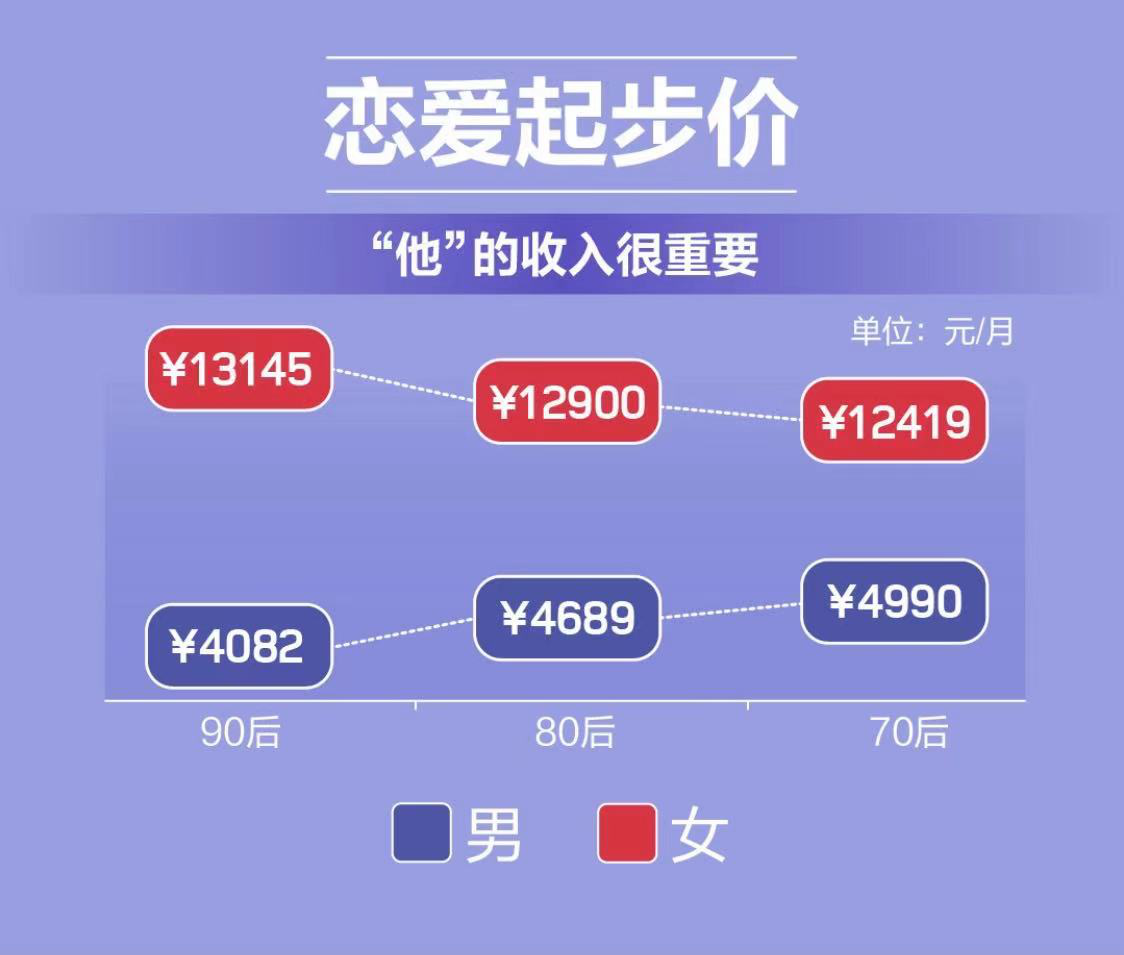 近年來,女性心中的戀愛起步價連續(xù)上升,男性則呈現(xiàn)波動上升趨勢!秷蟾妗凤@示:90后女性和70后男性對理想戀人的最低收入要求最高,分別為13145元/月和4990元/月。