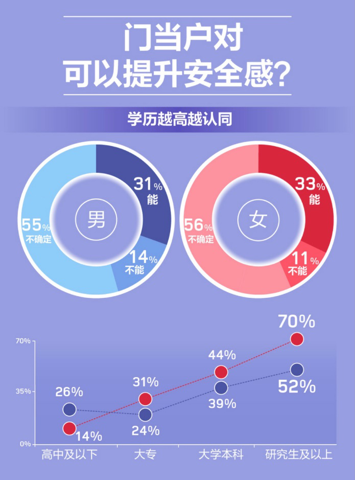 陳曦說的不無道理,根據(jù)《報告》的統(tǒng)計:隨學(xué)歷升高,認(rèn)可門當(dāng)戶對能帶來安全感的占比也升高,特別是研究生及以上學(xué)歷的女性,七成表示認(rèn)同。