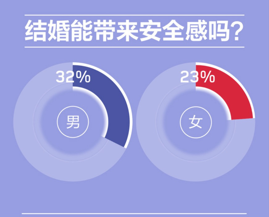 而結(jié)婚也不再像過去傳統(tǒng)觀念所言,一紙婚書雙方便能得到終身保障。隨著近年來離婚率的提高,男女逐漸對結(jié)婚能否帶來安全感這一問題有了重新的思考!秷蟾妗凤@示:32%的男性和23%的女性認(rèn)為結(jié)婚能帶來安全感,同時有42%的男女一致認(rèn)為財產(chǎn)公證對提高安全感有幫助。