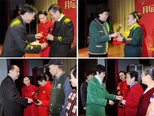 國家統(tǒng)計局離退休干部局副局長龍玲(左上)、國資委物資離退休干部局黨委書記王黎(右上)等為“金輝老人”頒獎、中華全國總工會原副主席、書記處書記張世平(左下)為月壇街道辦11個社區(qū)的書記贈送《沒有圍墻的養(yǎng)老院》一書