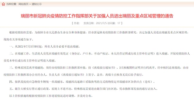 記者從云南省瑞麗市新冠肺炎疫情防控工作指揮部了解到,從7月5日8時起,所有人員非必要不進出瑞麗。在瑞麗工作、生活的人員憑在瑞麗有效憑證(身份證、戶口本、不動產權證、本人經營證照或行政主管單位證明)進入瑞麗。開展疫情防控人員憑本單位或行政主管單位證明進入瑞麗。姐告大橋實行禁止通行政策,原則上不進不出,特殊情況需要進出姐告國門社區(qū)的,憑市指揮部發(fā)放的通行證出入。