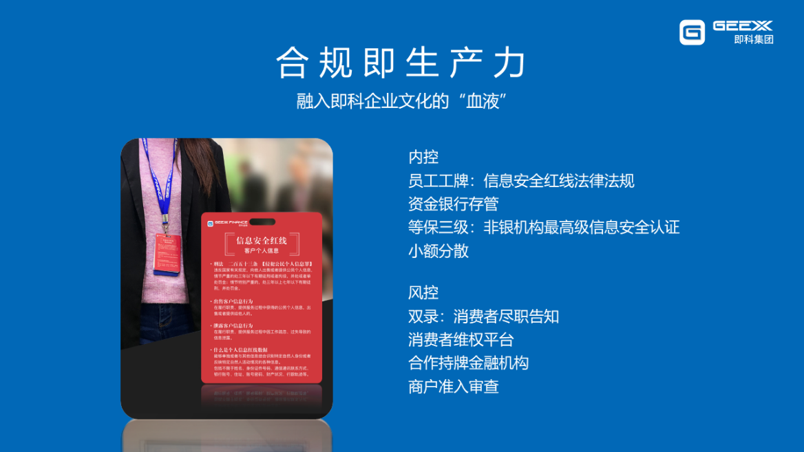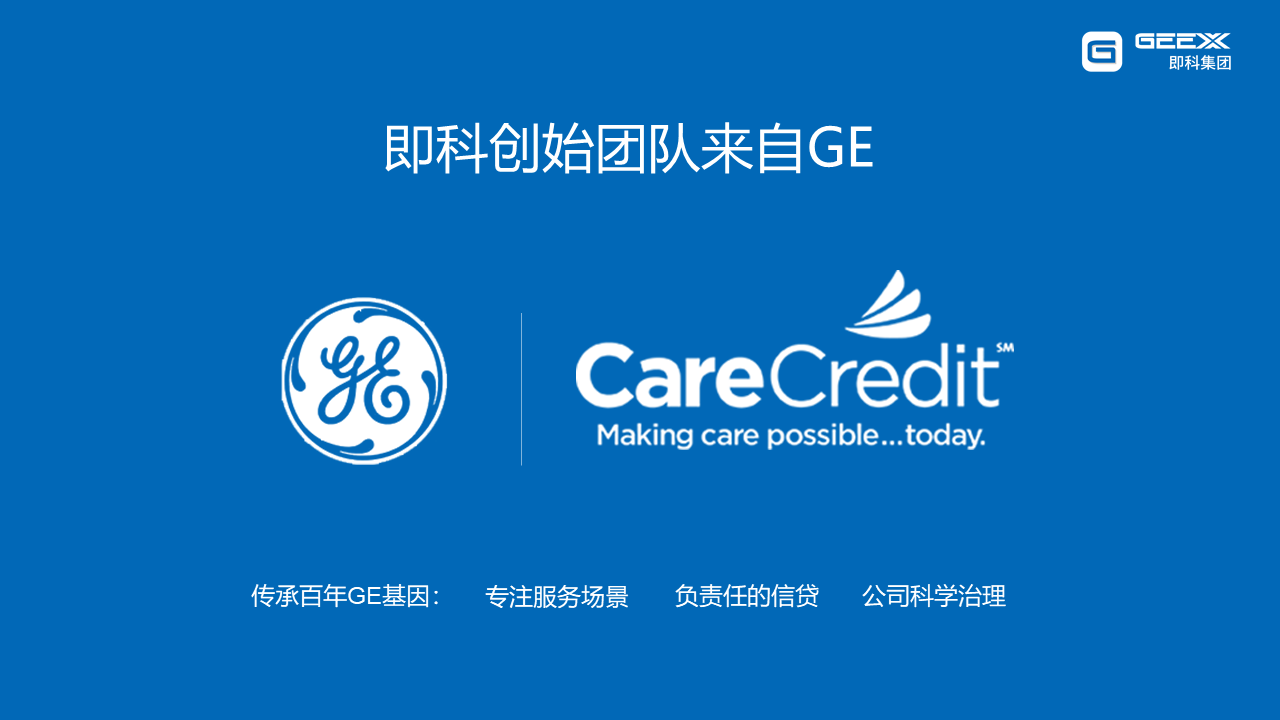 即科是一家金融科技公司。我和我的聯(lián)合創(chuàng)始人來自GE,GE在醫(yī)療界很有名,在金融界也很有名,他的消費(fèi)金融業(yè)務(wù)是全球第一。旗下業(yè)務(wù)CARE CREDIT,服務(wù)了美國17萬家診所,包括整形、齒科、眼科、聽力和寵物醫(yī)療。我們傳承了GE消費(fèi)金融的業(yè)務(wù)模式,也傳承了GE對于監(jiān)管和合規(guī)的敬畏。GE反反復(fù)復(fù)的宣貫和培訓(xùn),讓我們學(xué)到許多合規(guī)管理的技術(shù)和運(yùn)營方法。