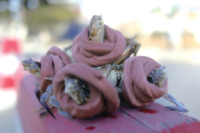 隨后,記者又接連探訪了4家海鮮攤位,發(fā)現(xiàn)一般海蟹的售價在55元至65元之間,而在此價格區(qū)間的海蟹,出售時蟹鉗上都要綁著厚厚的橡皮圈。這種橡皮圈粗細如食指,一般一個橡皮圈可以在蟹鉗上纏繞3至4圈。一番探訪后,記者在65號攤位花費70元,又購買了每斤55元、總重0.67kg的螃蟹。