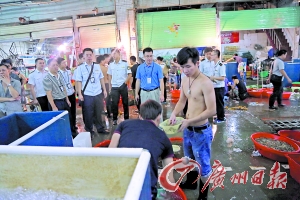 本報訊 (記者潘播攝影報道)根據第二季度水產品例行監(jiān)測發(fā)現(xiàn)的突出問題和前期摸底調查的情況,市食藥局于8月29日凌晨組織多部門聯(lián)合在深圳市布吉海鮮批發(fā)市場開展了一次水產品質量安全集中執(zhí)法行動——“清水”專項執(zhí)法監(jiān)督抽查行動。