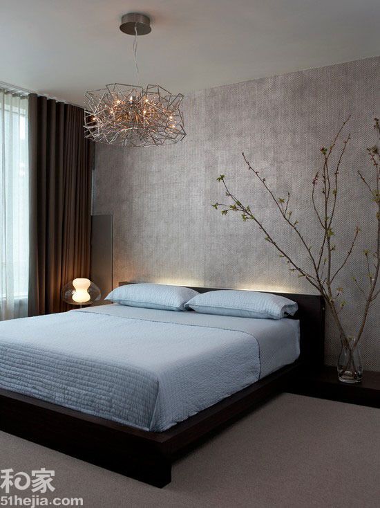 褐色、灰色、咖啡色……這些顏色搭配在一起,讓臥室更多了一份理性的冷靜。造型外張的吊燈跟裝飾植物卻又一定程度暴露了空間不甘于平庸的野心。室內(nèi)多簡潔線條的家居裝飾,再做簡單色彩搭配,淺藍(lán)的突然出現(xiàn)讓臥房足夠冷靜!