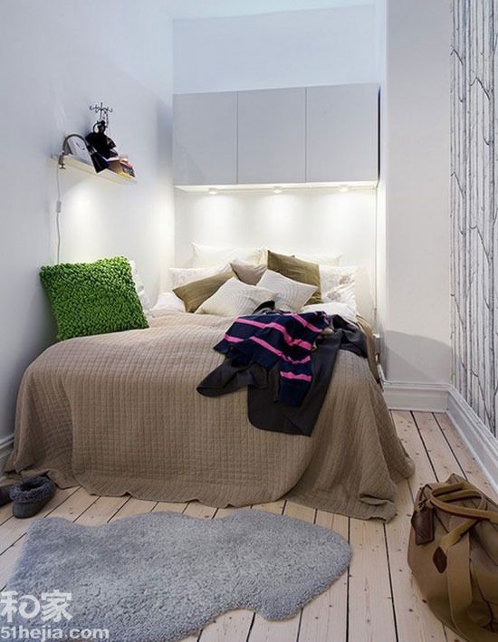 這張床十分低矮,就好像直接放在地面上,再加上厚厚的床墊,溫馨舒適的小臥室得以呈現(xiàn)出來。床頭板的選取給矮矮的床提供了些許的安全感,同時也是床頭完好的裝飾物。
