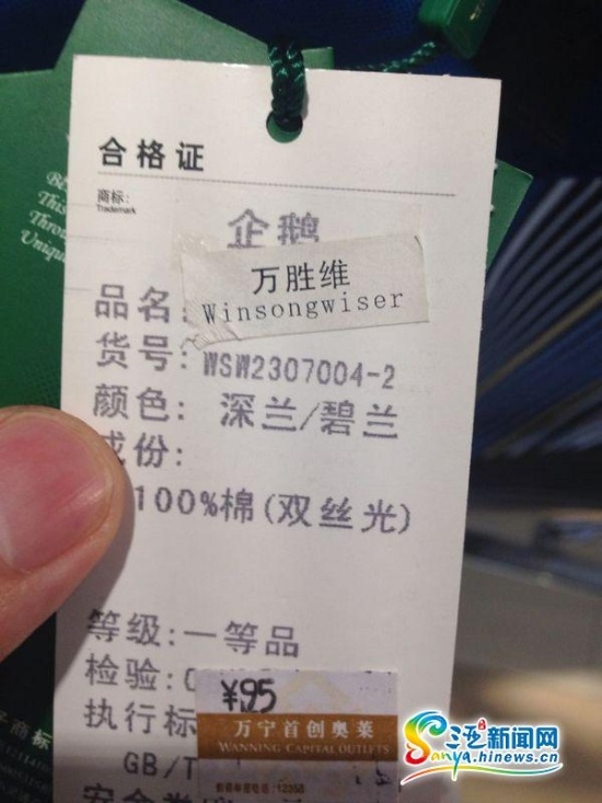 隨后,記者來到了位于奧特萊斯二樓的“萬勝維”男裝專賣店,在這家宣傳特價出售專柜衣服的店內(nèi),T恤接近“白菜價”,58元即可買到一條。售貨員向記者介紹該品牌源自美國,是知名品牌,至于衣服標(biāo)簽上產(chǎn)地寫的中國上海是因為取得了美國公司授權(quán)。記者注意到,該品牌衣服上的標(biāo)簽“萬勝維”是被臨時貼上去的,撕掉之后發(fā)現(xiàn)衣服商標(biāo)卻為“企鵝”,令人不免產(chǎn)生懷疑。記者查詢發(fā)現(xiàn),“萬勝維”官網(wǎng)的介紹存在疑點;該品牌的介紹實際是“萬星威”品牌的歷史和文化。為進(jìn)一步核實情況,記者依據(jù)衣服標(biāo)簽上的電話試圖聯(lián)系衣服生產(chǎn)商上海企威服飾有限公司以及“萬勝維”品牌營運中心,但所有電話均無法接通,其中一個電話已經(jīng)為別人所用。至此,該公司已變成一家“失聯(lián)”公司。