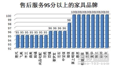 2012年得分在95分以上的企業(yè)有12家,而2013年調(diào)查的70家企業(yè)中,得分在95分以上的企業(yè)有20家,其中全友、聯(lián)邦、雅蘭、宜華、亞振、松堡王國(guó)、慕思、掌上明珠等7家企業(yè)獲得了100分的成績(jī)。而2012年家具行業(yè)取得滿(mǎn)分的企業(yè)僅慕思、皇朝、美克美家3家。今年得滿(mǎn)分的企業(yè)中有不少企業(yè)成績(jī)有大幅度的躍升,比如全友在2012年的調(diào)查中得分為68分,2013年的調(diào)查中獲得100分。全友作為全國(guó)知名的大品牌,在實(shí)力和品牌知名度不斷提升的同時(shí),服務(wù)水平也取得了長(zhǎng)足的進(jìn)步。