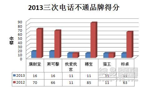 2013年很多企業(yè)保持了良好的服務(wù)水平,在電話(huà)調(diào)查中取得了不錯(cuò)的成績(jī)。但是也有企業(yè)連續(xù)兩年售后服務(wù)得分非常低。今年的調(diào)查中,康耐登、斯可馨、我愛(ài)我家、穗寶、貓王、標(biāo)卓6家企業(yè)的電話(huà)無(wú)論是工作日還是節(jié)假日都無(wú)法接通,導(dǎo)致其分?jǐn)?shù)都低于20分。因康耐登和斯可馨官網(wǎng)上有800或400電話(huà),因此得分比另外4家高了5分。