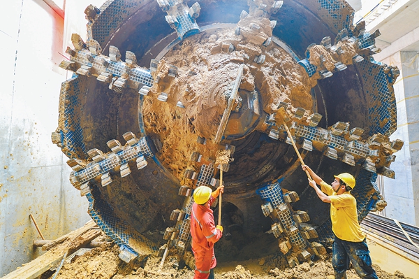 工人正在整理用于軌道建設(shè)的盾構(gòu)機(jī)。