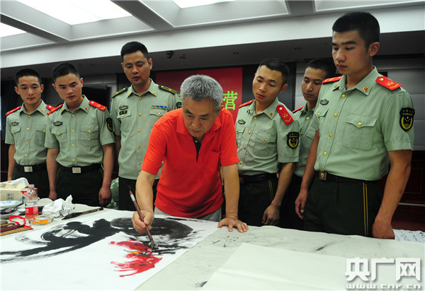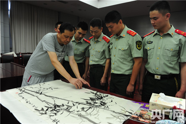 在場的武警官兵無不為書畫家們妙筆生花的技藝連連贊嘆,有的還現(xiàn)場與書畫家們共同探討書畫藝術創(chuàng)造。