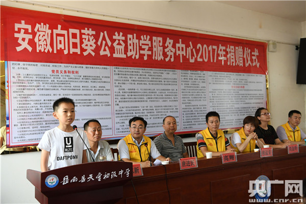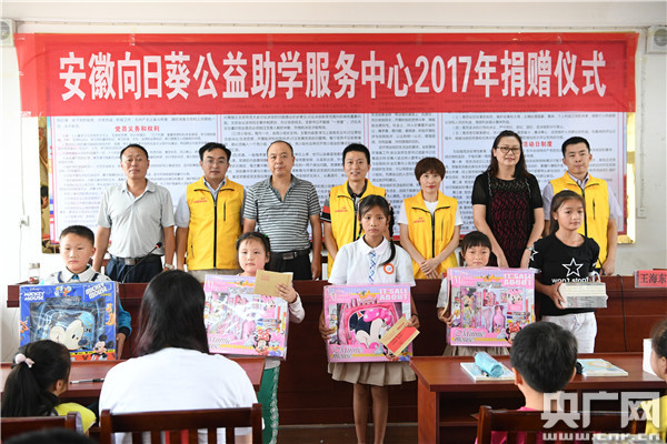 當(dāng)天上午,安徽向日葵公益助學(xué)服務(wù)中心2017年捐贈儀式在大別山腹地岳西縣舉行,28名當(dāng)?shù)氐呢毨W(xué)子現(xiàn)場領(lǐng)到了愛心紅包和圖書、文具、書包等“愛心禮包”。在此次幫助的28名貧困孩子中,20名由愛心企業(yè)安徽夏陽機(jī)動車輛檢測股份有限公司對接。