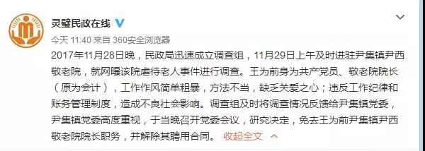 11月30日上午,靈璧縣民政局官方微博“靈璧民政在線”發(fā)布了通報(bào)稱:“2017年11月28日晚,民政局迅速成立調(diào)查組,11月29日上午及時(shí)進(jìn)駐尹集鎮(zhèn)尹西敬老院,就網(wǎng)曝該院虐待老人事件進(jìn)行調(diào)查。王為前身為共產(chǎn)黨員、敬老院院長(zhǎng)(原為會(huì)計(jì)),工作作風(fēng)簡(jiǎn)單粗暴,方法不當(dāng),缺乏關(guān)愛(ài)之心;違反工作紀(jì)律和賬務(wù)管理制度,造成不良社會(huì)影響。調(diào)查組及時(shí)將調(diào)查情況反饋給尹集鎮(zhèn)黨委,尹集鎮(zhèn)黨委高度重視,于當(dāng)晚召開(kāi)黨委會(huì)議,研究決定,免去王為前尹集鎮(zhèn)尹西敬老院院長(zhǎng)職務(wù),并解除其聘用合同!