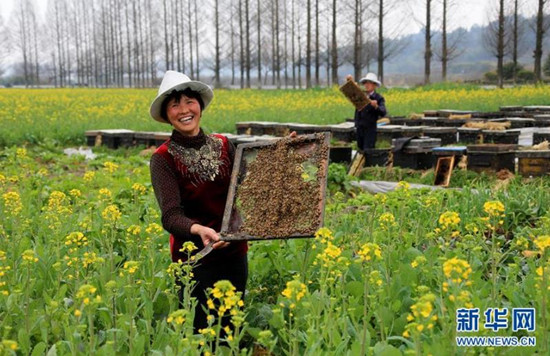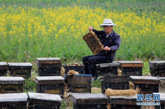 2月20日,安徽省黃山市萬(wàn)安鎮(zhèn)蜂農(nóng)在油菜花田里放蜂割蜜。