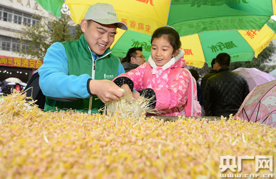 小學(xué)生正在體驗(yàn)采摘豆芽并了解豆芽的生長過程