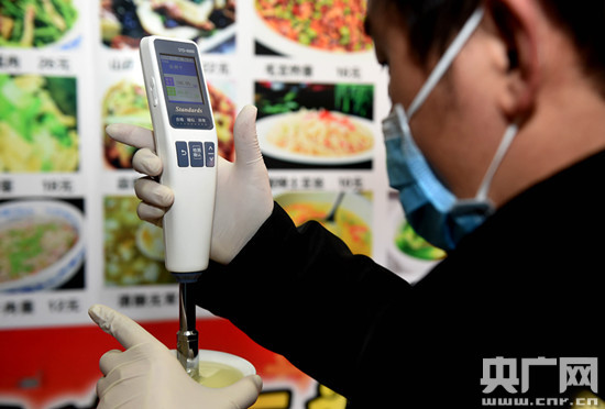 執(zhí)法工作人員使用食品快速檢測(cè)儀對(duì)轄區(qū)餐飲場(chǎng)所及網(wǎng)絡(luò)外賣平臺(tái)后廚使用的油品進(jìn)行快速檢測(cè)。