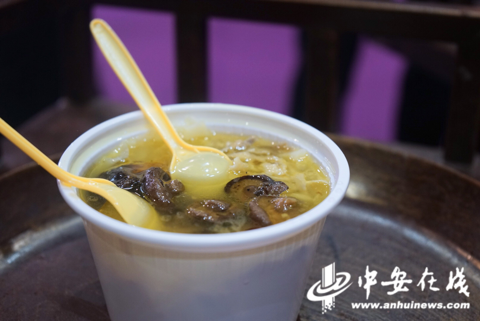在安徽劉鴻盛餐飲展區(qū),和面師傅正嫻熟地用搟面杖擠壓著白面。另一邊,砂鍋中嫩爛的雞肉、去梗的冬菇已準(zhǔn)備就緒。待客來(lái)時(shí),薄如紙的餃子皮加入調(diào)味好的肉糜后放置鍋中。當(dāng)水餃出鍋,撒上雞丁、冬菇、蔥花等佐料,澆上雞湯、冬菇湯后,便端至每位食客手中。