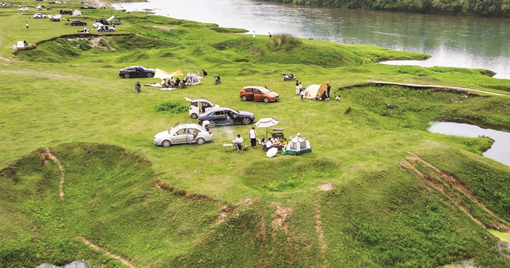 4月10日,歙縣王村鎮(zhèn)杏村,春水初生,江畔草甸如茵鋪開。市民游客攜家?guī)в,以帳篷為廬、以清風(fēng)為伴,在郊野間赴一場春日之約,盡享山水間的松弛與歡趣。鄭宏/攝