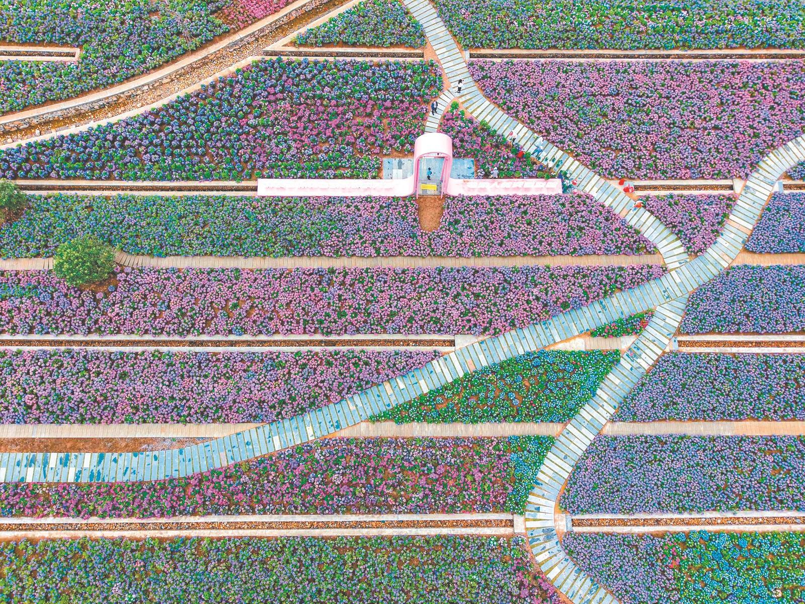 4月12日,銅陵市義安區(qū)鳳凰山風(fēng)景區(qū),繡球花相繼盛開,美不勝收,吸引眾多游客前來賞花拍照。通訊員 劉伯順 攝