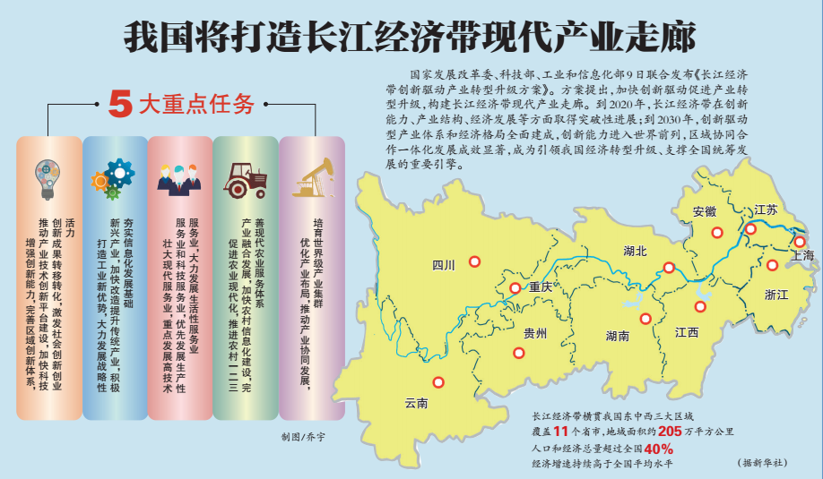 國家發(fā)展改革委、科技部、工業(yè)和信息化部9日聯(lián)合發(fā)布《長江經(jīng)濟(jì)帶創(chuàng)新驅(qū)動(dòng)產(chǎn)業(yè)轉(zhuǎn)型升級(jí)方案》。方案提出,加快創(chuàng)新驅(qū)動(dòng)促進(jìn)產(chǎn)業(yè)轉(zhuǎn)型升級(jí),構(gòu)建長江經(jīng)濟(jì)帶現(xiàn)代產(chǎn)業(yè)走廊。