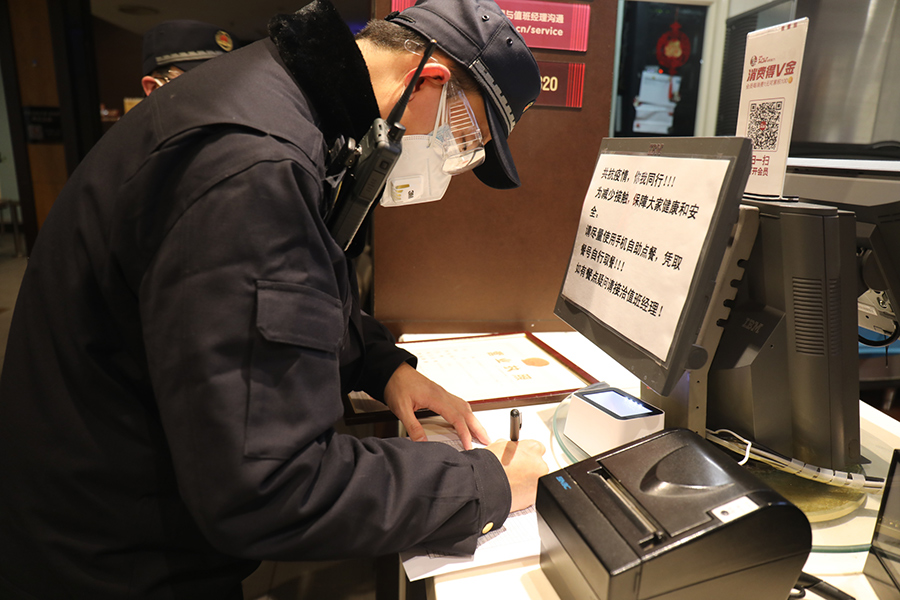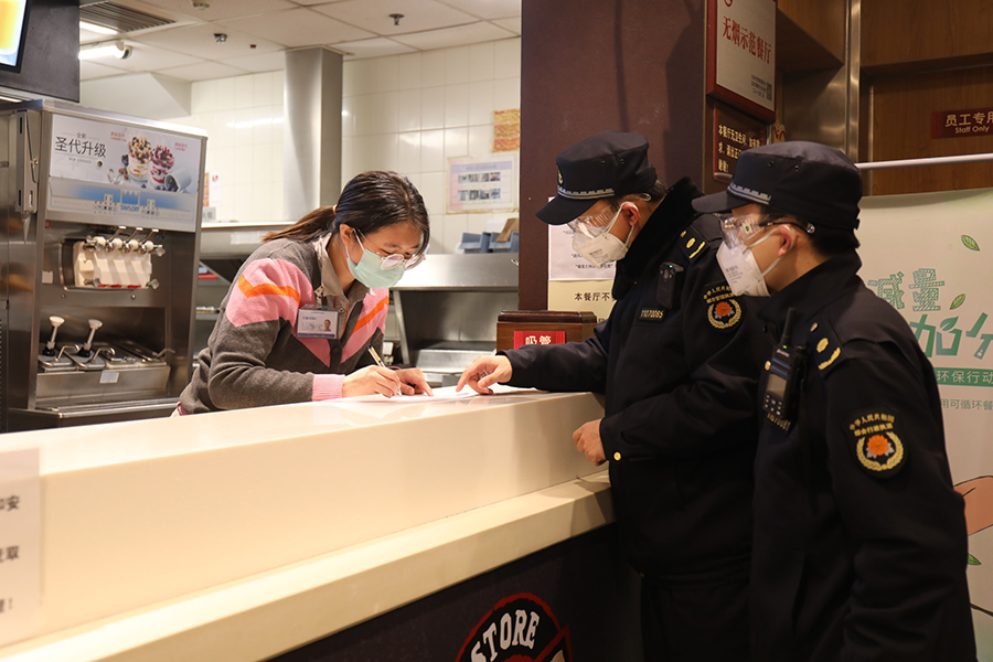 張獻(xiàn)輝,就是其中一名連續(xù)奮戰(zhàn)多天的城管隊(duì)員。記者跟隨他來(lái)到站內(nèi)的一家肯德基餐廳。進(jìn)門(mén)后,張獻(xiàn)輝查看了餐廳的營(yíng)業(yè)執(zhí)照并進(jìn)行了記錄,隨后檢查了餐廳員工健康登記情況和公共區(qū)域的消毒情況,并詢(xún)問(wèn)餐廳是否有返京員工,是否按要求隔離。他提示餐廳負(fù)責(zé)人,一定要提高重視,落實(shí)餐廳管控主體責(zé)任,顧客來(lái)購(gòu)買(mǎi)餐品時(shí)排隊(duì)要保持距離,堂食顧客要保持用餐距離,現(xiàn)在是非常時(shí)期,餐廚垃圾更要妥善處置,日產(chǎn)日清。