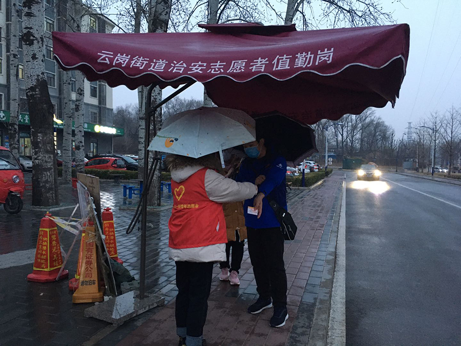 “晚上下班,在小區(qū)出入口看到了自己的街坊鄰居,也有同事,覺得很親切!”居住在云崗的居民說。地區(qū)單位職工一手抓復(fù)工復(fù)產(chǎn)、一手抓疫情防控,結(jié)束一天工作的他們,在夜幕降臨時(shí)走上社區(qū)疫情防控一線的“新崗位”,履行新職責(zé)。目前,云崗街道轄區(qū)共有防控卡口69個(gè),基本分布在地區(qū)單位職工小區(qū)。街道將各社區(qū)卡口具體位置進(jìn)行梳理,制作“疫情防控值守點(diǎn)位圖”,各地區(qū)單位結(jié)合樓院產(chǎn)權(quán)情況主動(dòng)認(rèn)領(lǐng)40個(gè)卡口,組織本單位就近居住的職工志愿者分組排班,于每天晚上6點(diǎn)至9點(diǎn)下班高峰時(shí)段頂崗值守。每晚上崗前,由包片社區(qū)干部對(duì)職工志愿者進(jìn)行崗前培訓(xùn),并發(fā)放口罩、手套等防護(hù)物資。職工志愿者們?cè)谙掳喔叻鍟r(shí)段來臨前準(zhǔn)時(shí)出現(xiàn)在小區(qū)出入口,接過手套、額溫槍,戴好口罩、紅袖標(biāo),進(jìn)行出入證查詢、體溫測(cè)量、來訪登記等工作,有時(shí)甚至來不及吃晚飯就匆匆忙活起來,扛起人流、車流量最為密集時(shí)段的重任,默默守護(hù)單位屬地和社區(qū)家園。晚9點(diǎn)職工志愿者值守結(jié)束后,小區(qū)物業(yè)保安人員持續(xù)在崗,確保夜間防控不留空白。