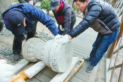 昨天,市總工會將機(jī)關(guān)院內(nèi)發(fā)現(xiàn)的清代露陳墩等8件石刻文物捐贈(zèng)給圓明園收藏。記者 吳鏑攝