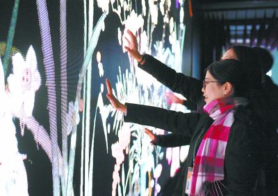 “宮里過(guò)大年”數(shù)字沉浸體驗(yàn)展將于22日在乾清宮東廡開(kāi)幕,圖中展示的是“花開(kāi)歲朝”部分,揮動(dòng)手臂,蝴蝶飛舞,花枝搖曳。新華社記者金良快 攝
