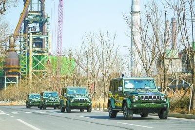 4輛北汽吉普車在首鋼園區(qū)內(nèi)道路演示隊(duì)列自動(dòng)駕駛。本報(bào)記者鄧偉 攝