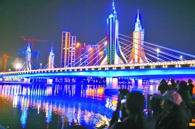 晚6時許,隨著夜幕降臨,運(yùn)河兩岸燈光漸次亮起。沿河樹木在環(huán)形燈、投光燈、星星燈的映照和點(diǎn)綴下,如火樹銀花,如星河璀璨,變成夢幻般的童話世界。一座座橋梁被燈光通體照射,白天灰色的橋體,搖身一變成為流光溢彩、各具風(fēng)姿的大型藝術(shù)裝置。橋上燈光與水面倒影交相輝映,共同構(gòu)成一曲奇幻、壯闊的城市交響曲。