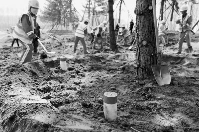 不止是“呼吸”管道,這片綠地施工現(xiàn)場還有不少有意思的細節(jié):平常種樹,都會在填好的樹坑外頭做一個圍堰,方便澆水;可在這里的“千年守望林”,從拆遷村移植來的大樹,統(tǒng)統(tǒng)都是雙層圍堰,即以樹苗為中心,組成同心圓或者回字形,兩個圍堰分別澆水,為根系補給充足的水分。
